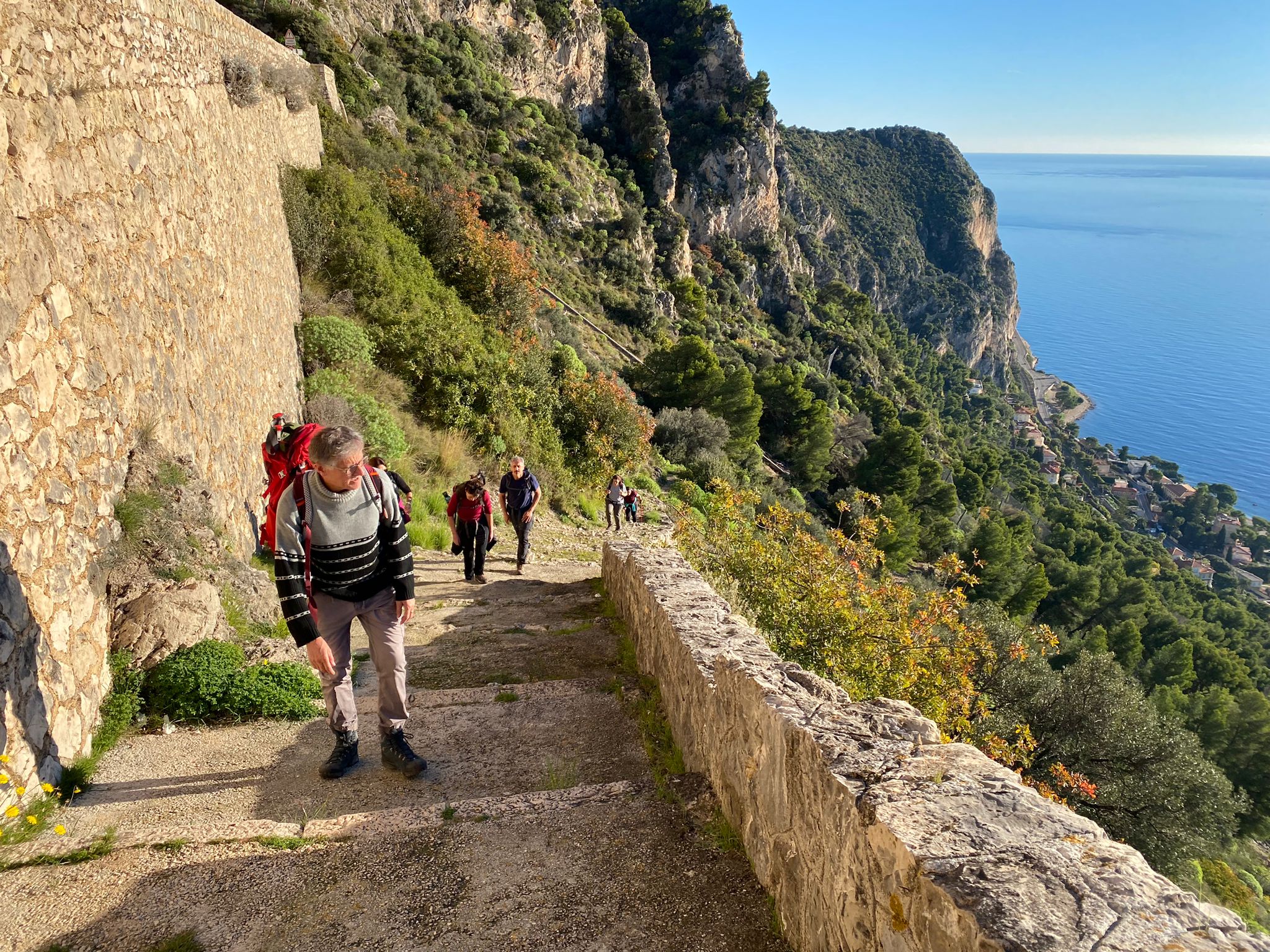 Aujourd’hui, une randonnée d’exception le long des crêtes côtières, tout en escaliers, entre ciel et mer. Certains se sont amusés à les compter : 286, 289… bref, un certain nombre. Sous un ciel bleu sans l’ombre d’un nuage pour troubler la vue, la Méditerranée s’étalait, calme et argentée, scintillant sous les caresses du soleil.Le départ fut donné depuis le charmant village de Beaulieu. Une montée immédiate et exigeante nous attendait, mettant nos corps à rude épreuve, réclamant toute notre énergie et instaurant le silence. Mais, entre deux ascensions, des portions plus douces nous offraient un répit bienvenu, et les échanges ainsi que les rires reprenaient aussitôt, redonnant souffle et entrain à chacun.