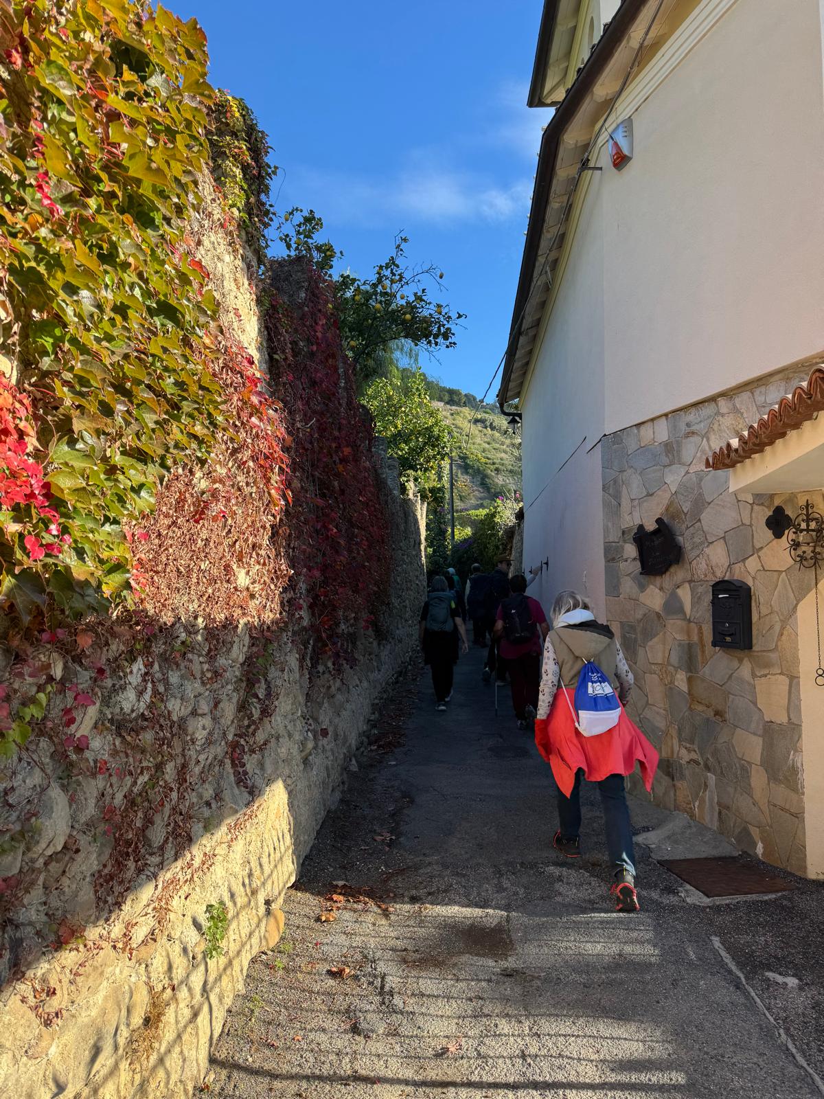 Le groupe des Bouquetions est partis à huit heures pile, l’air encore frais parcourt l’approche de la frontière et du sentier frontalier degli Alpi-Mare. L’itinéraire nous mène d’abord vers Grimaldi inférieur, puis Grimaldi supérieur, deux hameaux qui semblent accrochés à la montagne comme pour mieux surveiller Balzi Rossi et la mer. Tout est calme, jusqu’au moment où un grillage solide nous sépare d’une armada de chiens en furie. On garde nos distances, on accélère un peu, et chacun fait semblant d’être très détendu.