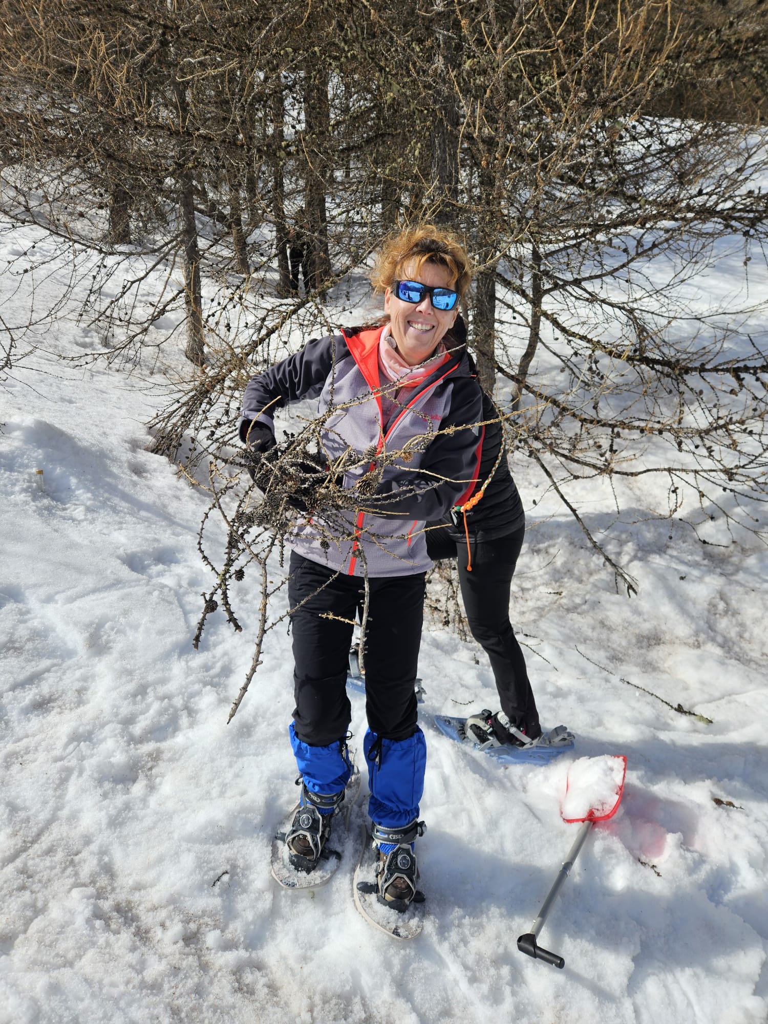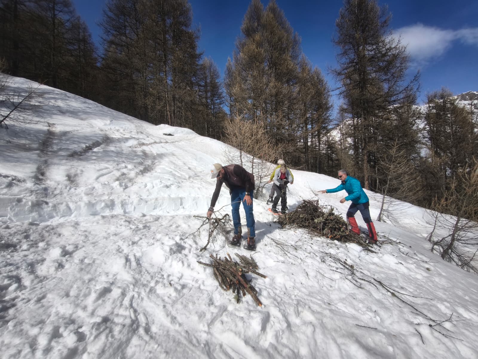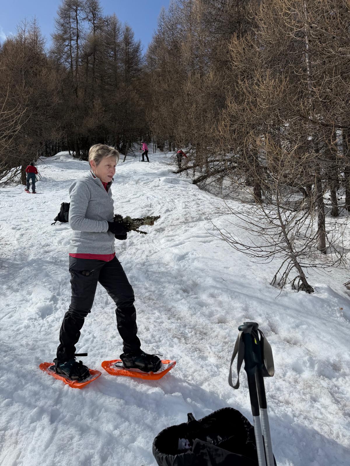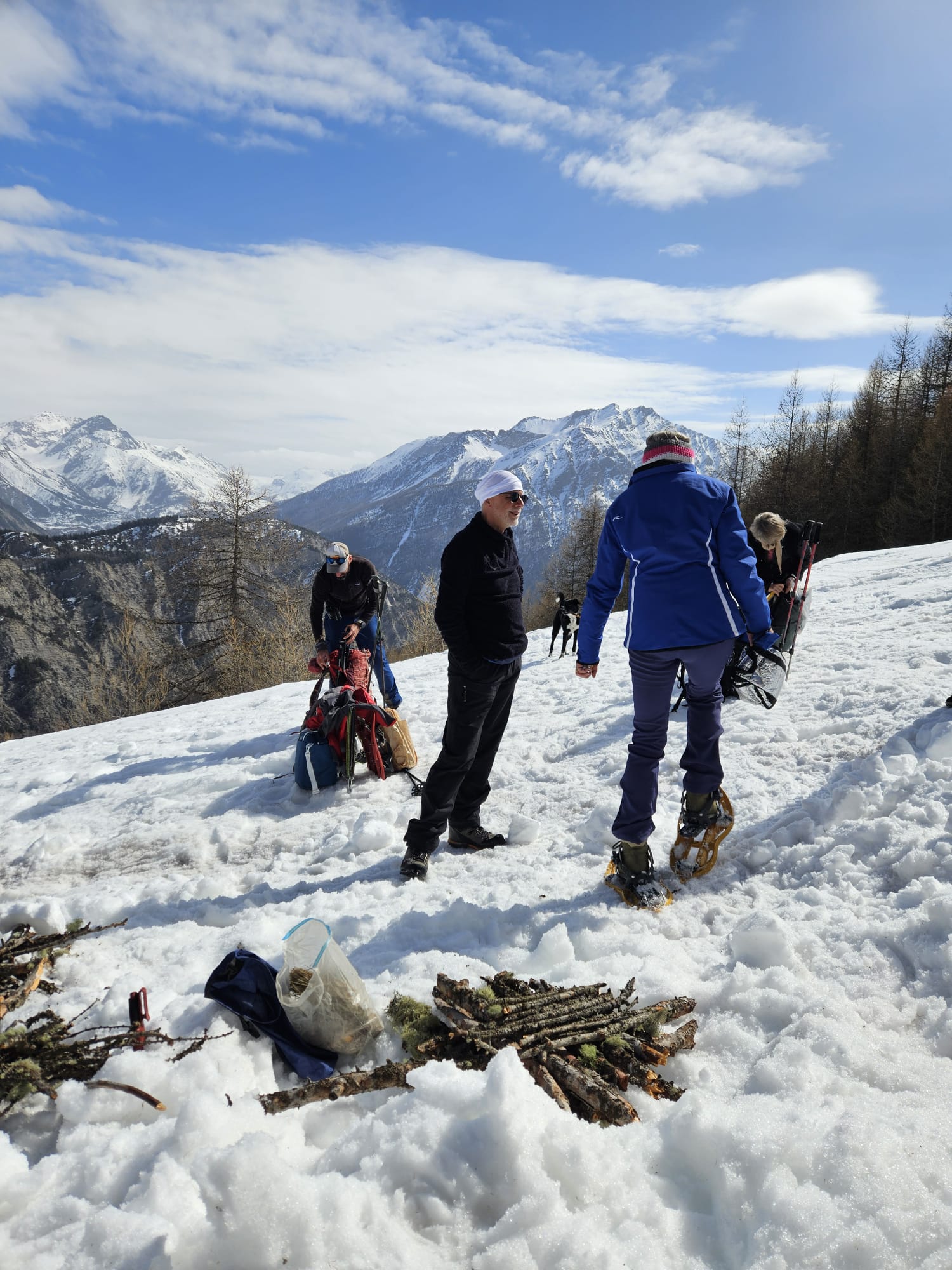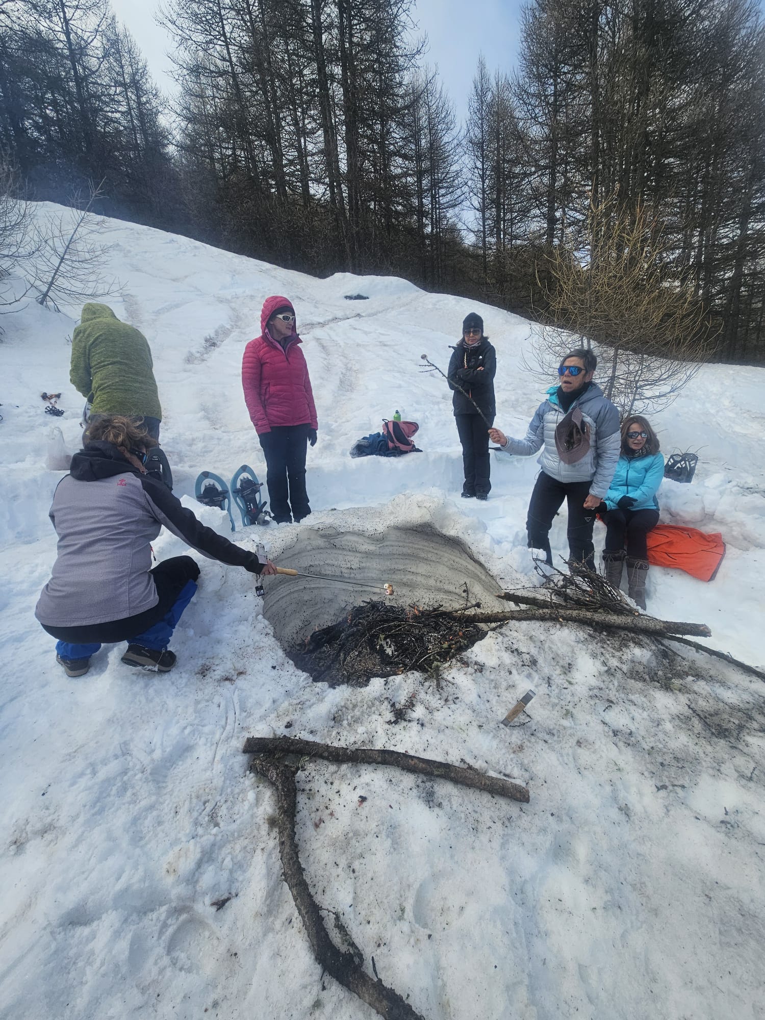C'est ainsi qu'après avoir cheminé en raquettes, et appris pourquoi les mélèzes perdent leurs aiguilles nous avons : ramassé du bois, de la paille, du lychen, fait un feu 🔥, creusé une banquette dans la neige, dégusté un barbecue, pratiqué le "cul cul glisse" etc, etc ....