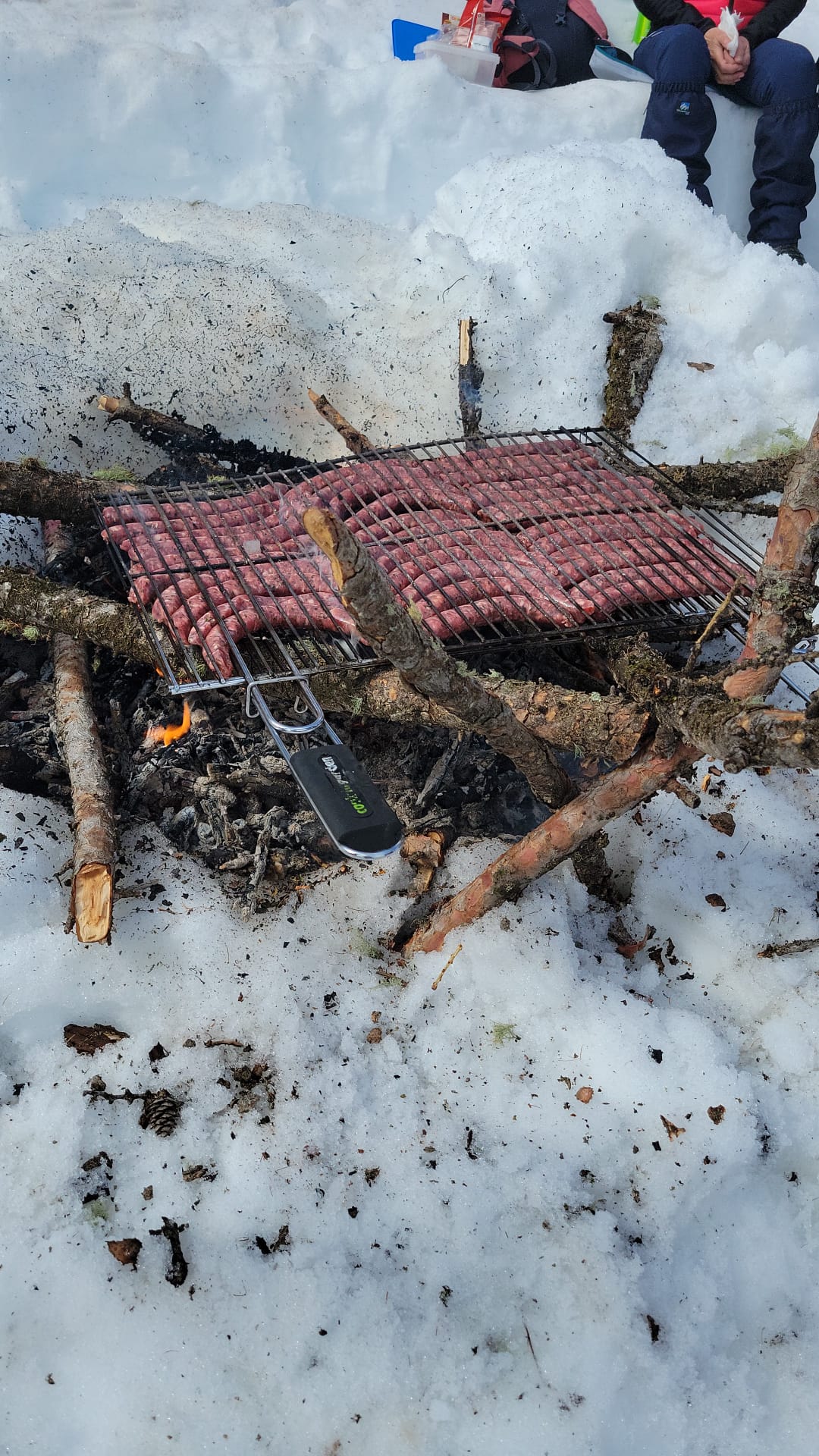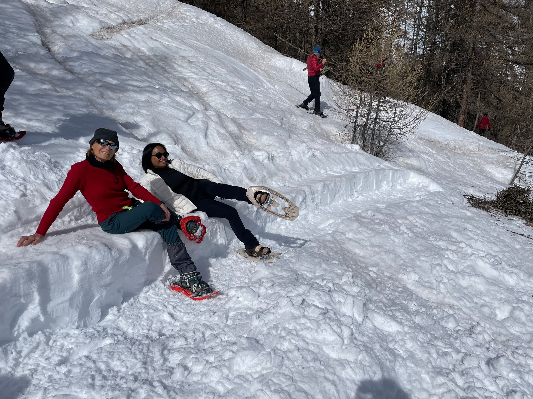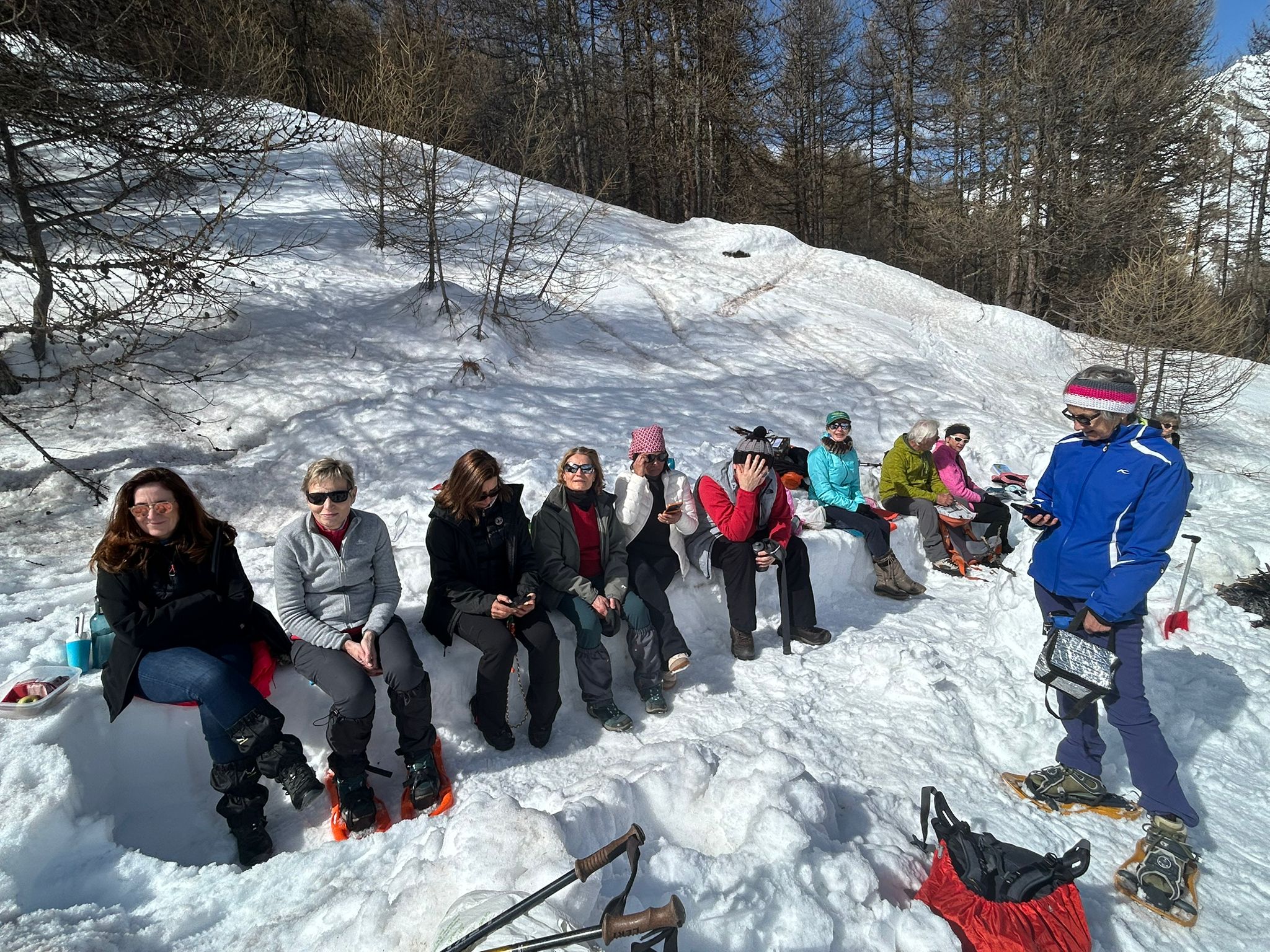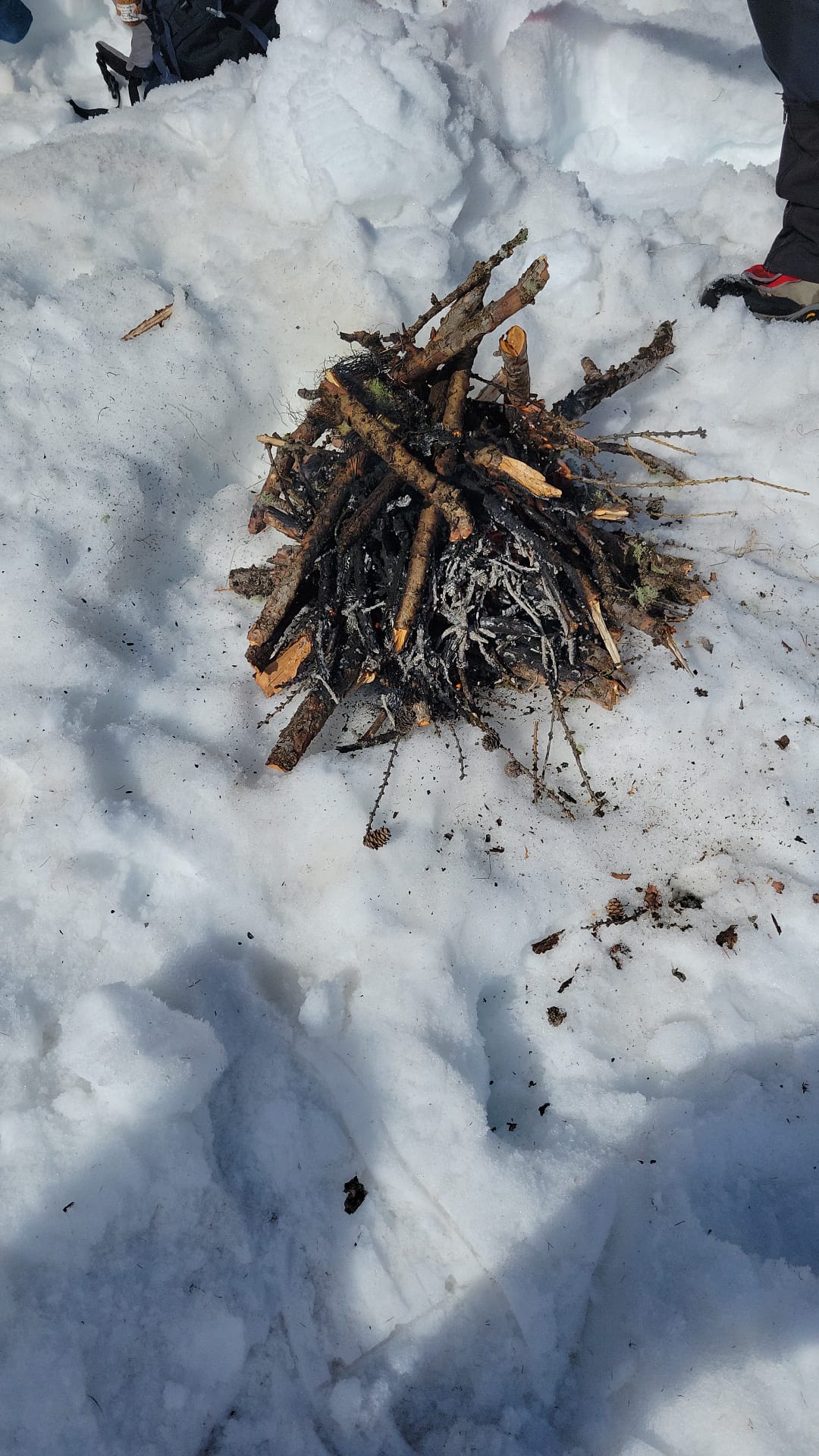 C'est ainsi qu'après avoir cheminé en raquettes, et appris pourquoi les mélèzes perdent leurs aiguilles nous avons : ramassé du bois, de la paille, du lychen, fait un feu 🔥, creusé une banquette dans la neige, dégusté un barbecue, pratiqué le "cul cul glisse" etc, etc ....