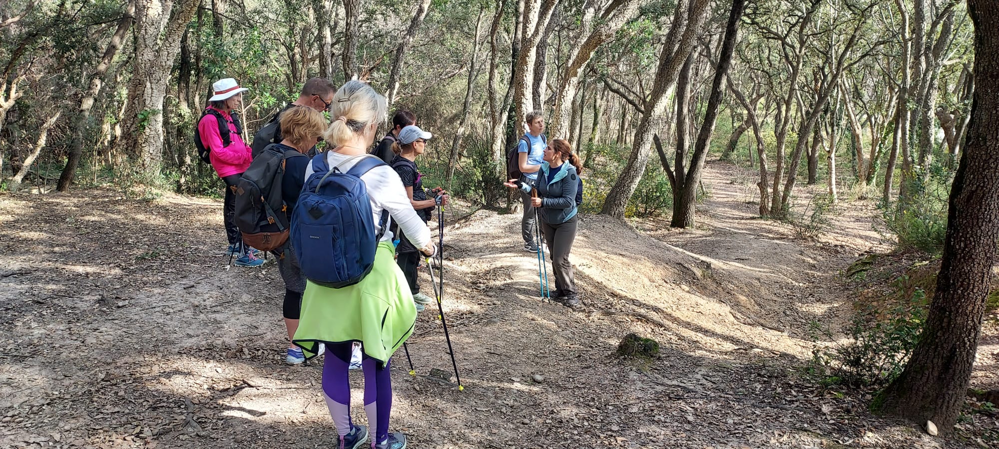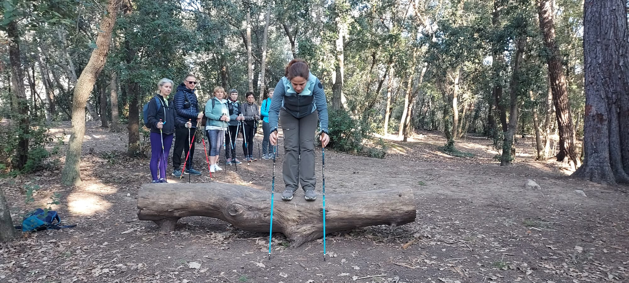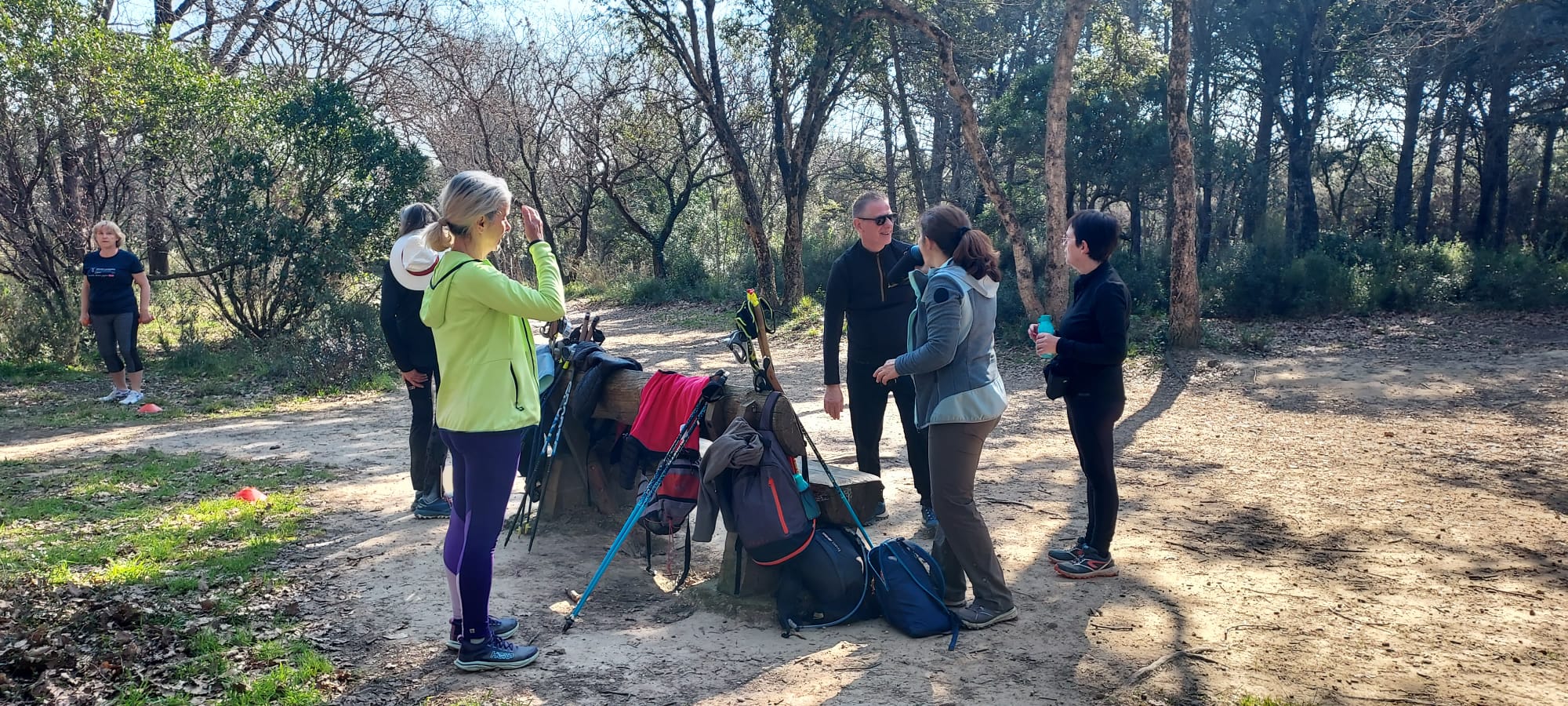 Échauffements pour commencer la séance de marche nordique, puis chaque technique étudiée et répétée à plusieurs reprises, mise en pratique de la marche, avec correction de Nathalie, à chacune.