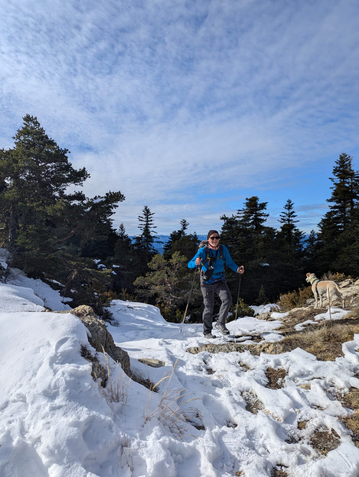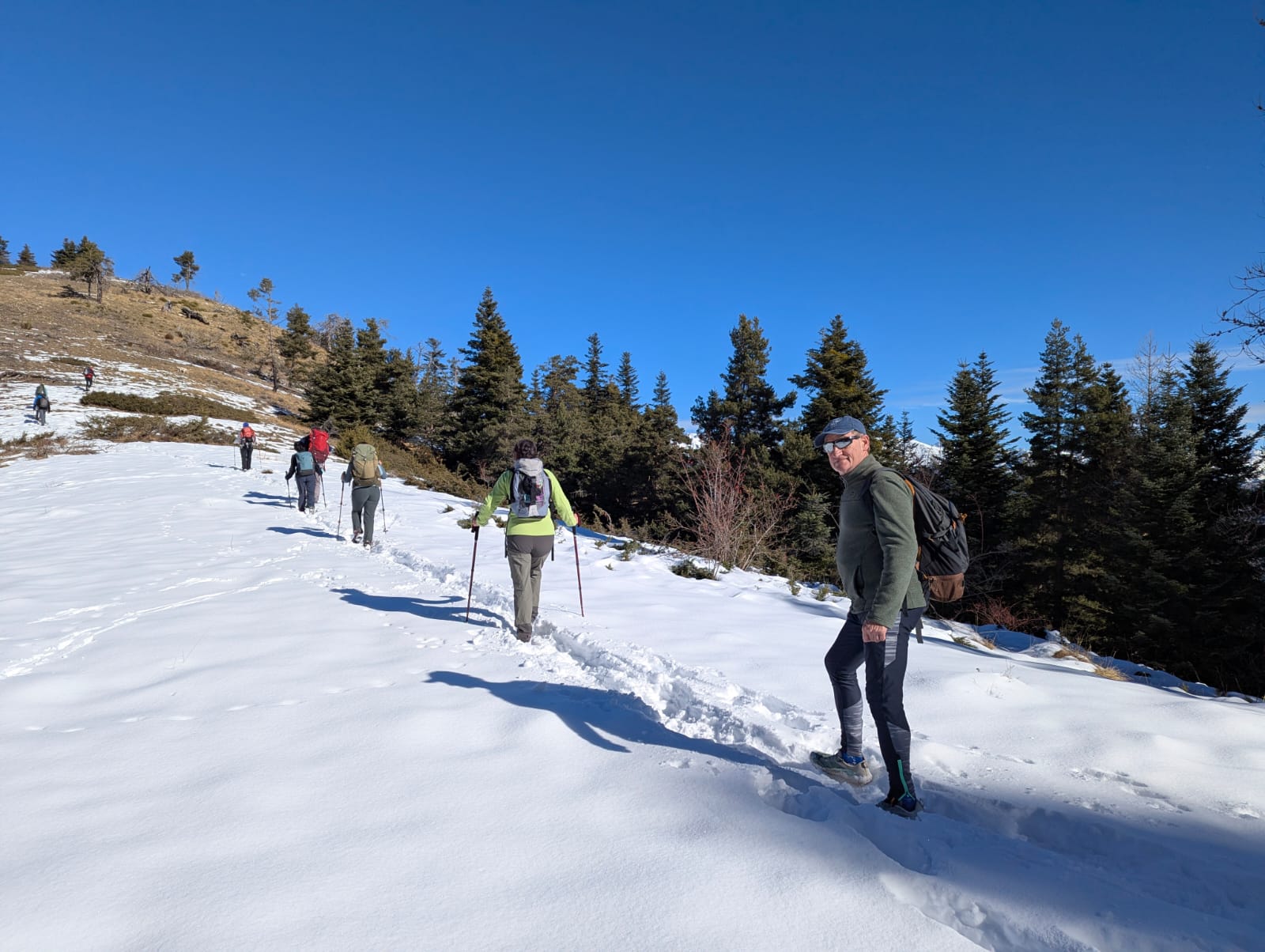 En poursuivant notre montée, nous avons atteint le Col de la Courbaisse à 1629 m. Rencontre avec l’autre groupe qui a dû renoncer à son itinéraire par sécurité. La neige s'est progressivement installée sur notre parcours, rendant l'ascension plus exigeante. L’effort en valait la peine, car les paysages enneigés ajoutaient une touche féérique à notre randonnée. Nous avons pris quelques minutes pour admirer la vue, prendre quelques photos avant de poursuivre... en espérant secrètement qu'une remontée mécanique se matérialise par magie. Mais comme toujours, notre groupe avance avec entrain, prêt à affronter la suite du parcours !